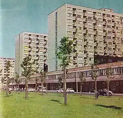 - Jeszcze przed zakończeniem budowy osiedle zostało wykorzystane jako plan zdjęciowy w komedii Nie lubię poniedziałku[8]. Nakręcono tam m.in. sceny zasypania piaskiem przez ciężarówkę samochodu Syrena i robotnika, który budzi się na płycie podniesionej wysoko przez dźwig[9].