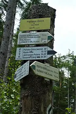 - Szczyt wzniesienia położony jest około 100 metrów na północ od polsko-czeskiej granicy[1].
