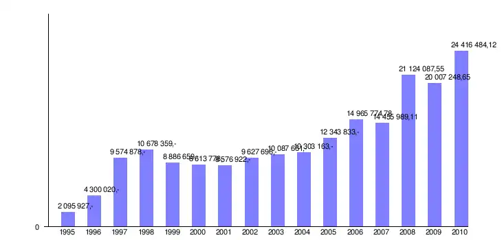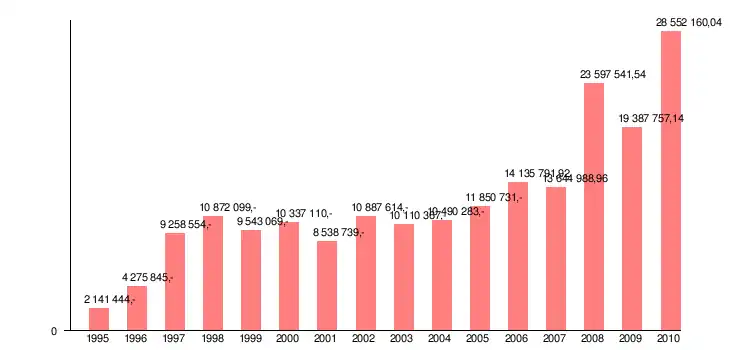 Rysunek 1.2 Wydatki ogółem w Gminie Pacanów w latach 1995-2010 (w zł)[8]