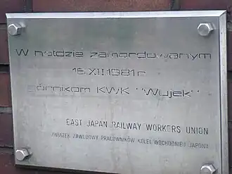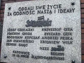 - ↑ Redakcja, 16 grudnia 1981 roku w Katowicach oddziały ZOMO i wojska dokonały pacyfikacji kopalni "Wujek". Zginęło 9 górników, a 21 zostało rannych » Historykon.pl [online], Historykon.pl, 15 grudnia 2020 [dostęp 2020-12-16] (pol.).