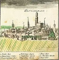 - ↑ Detlef Haberland: Die „Silesiographia” und „Breslo-Graphia” von Nicolaus Henel von Hennenfeld. Arkadiusz Cencora, Diana Codogni-Łańcucka. Wrocław: Biblioteka Uniwersytecka we Wrocławiu, 2011, s. 179. ISBN 978-83-910595-2-4.