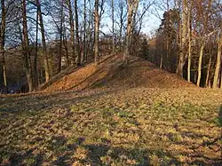 Około 100 m na południe od pałacu, na lewym brzegu rzeki (oraz około 130 m na północ od drogi krajowej KK157) znajduje się 12-13-metrowy kopiec, 18 m długości i 11 m szerokości. Otoczony był groblą, najlepiej zachowaną po południowo-zachodniej stronie. Badania prowadzone w 1967 roku przez Litewski Instytut Historii pozwoliły na stwierdzenie, że pochodzi on z przełomu I i II tysiąclecia. Grodzisko (lub kurhan), zwane Górą Kalwinów[8] jest zabytkiem Republiki Litewskiej od 19 lutego 2005 roku nr AR416 / A1334K.