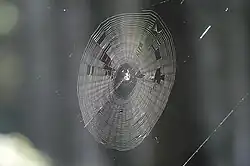 - promienista[1] (ang. orb web[11]) – ze środkiem (pępkiem)[1] i odchodzącymi od niego promieniami, typowa dla krzyżakowatych[12], bywa zaopatrzona w stabilimentum[13],