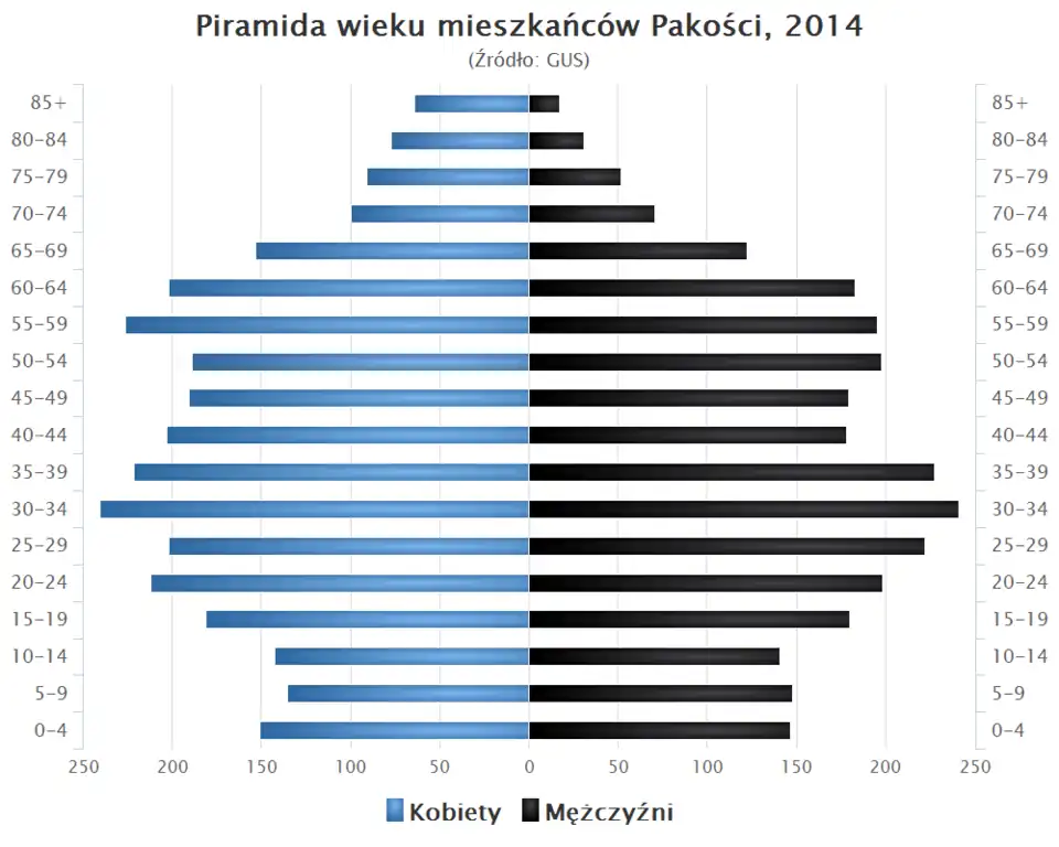 Piramida wieku mieszkańców Pakości w 2014 roku[19].