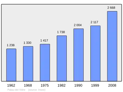 Według danych na rok 1990 gminę zamieszkiwały 2004 osoby, a gęstość zaludnienia wynosiła 193 osoby/km² (wśród 1545 gmin Langwedocji-Roussillon Palau-del-Vidre plasuje się na 197. miejscu pod względem liczby ludności, natomiast pod względem powierzchni na miejscu 733.).