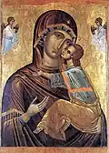Jedna z nich wykonana jest w tradycyjnym stylu Eleousa, znanym też jako Matka Boża Czułości. Ikonografia Eleousa zazwyczaj przedstawia twarze Matki Bożej i Dzieciątka dotykające się czule, oraz z ramieniem Dzieciątka obejmującym szyję Matki[46].