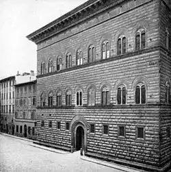 W dolnej części elewacji znajduje się portal zamknięty szerokim łukiem, po jego bokach rząd prostokątnych okien. Wyżej, pomieszczenia dwóch pięter oświetlają dwudzielne okna w górnej części zamknięte łukami. Budynek wieńczy podwójny, ząbkowany gzyms zaprojektowany przez Simona del Pollaiolo, zwanym Il Cronaca. Płaszczyzny kamiennej, rustykalnej elewacji zdobi boniowanie.