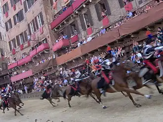 Kulminacyjnym punktem tego święta, którym żyje całe miasto i przyciąga tysiące turystów z całego świata, jest otwarta dla widzów, niezwykle emocjonująca, choć trwająca jedynie trzy okrążenia wokół placu, gonitwa konna. Wyścig rozgrywany jest dwa razy do roku 2 lipca i 16 sierpnia o godzinie 19 na głównym placu Sieny Piazza del Campo.
