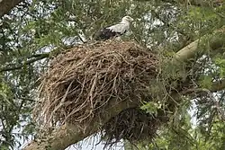 Duże gniazdo z patyków buduje wysoko na drzewie, zwykle w pobliżu wody; może być ono używane w kolejnych latach. Samica składa tylko jedno jajo[16].