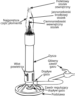 Palnik ten składa się zwykle z podstawki, w którą jest wmontowany wlot gazu oraz dyszy, w formie prostej, pionowej rury, która od dołu posiada otwory, przez które zasysane jest powietrze. Otwory te można zamykać i otwierać dzięki małemu, ruchomemu pierścieniowi zamocowanemu na dyszy, co umożliwia regulację szybkości zasysania powietrza i co za tym idzie temperaturę płomienia. Niektóre palniki posiadają też dodatkowo zawór gazu umożliwiający regulację szybkości jego przepływu, co umożliwia uzyskiwanie płomienia o różnej wysokości.