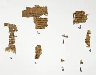 - ↑ PAPYRUS FRAGMENTS P957. [w:] Rylands Papyri [on-line]. Bible Resoruces Pages, UK: Katapi. [dostęp 2012-04-27].