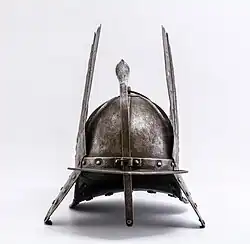 Charakteryzował się dzwonem modelowanym w sześć karbków zbiegających się na szczycie, gdzie znajdowało się kółko służące do zawieszenia hełmu, trójkątnymi policzkami o zaokrąglonych bokach z otworami słuchowymi, wyciętym daszkiem, przez który przechodził nosal mocowany śrubą, folgowym nakarczkiem oraz rzemiennymi pętlami służącymi do zawiązania hełmu pod brodą. Zazwyczaj był czerniony dla zabezpieczenia przed korozją.
