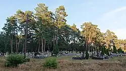 Założono też cmentarz. Najstarsze nagrobki zlokalizowane są w północnej części nekropolii oraz wzdłuż głównej alei[3]. Najstarszy nagrobek pochodzi z 1926[9]. Cmentarz ma 1,5 ha powierzchni. Znajduje się w odległości około 0,5 km od kościoła[3]. Obok cmentarza jest studnia[9].