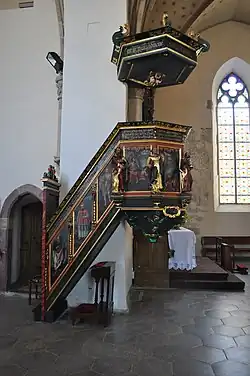 W kościele zachowała się ambona z 1619 r., fresk z XIV w. (odkryty w 2006), sklepienia krzyżowe w części wczesnogotyckiej i kamienne rzeźby na szczycie północnej kruchty. Obecnie trwa regotyzacja wnętrza kościoła.