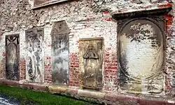 Na zewnątrz, obok głównego wejścia do świątyni, znajduje się ufundowana w 1724 figura św. Jana Nepomucena[1]. W zewnętrzne ściany kościoła wmurowane są płyty nagrobne z XVI i XVII wieku.