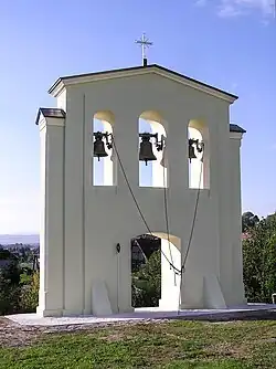 Przy drewnianym kościele znajduje się murowana dwukondygnacyjna dzwonnica arkadowa z drugiej połowy XIX wieku, która została zbudowana na miejscu wcześniejszej drewnianej. Pierwotnie mieściła się w obwodzie ogrodzenia placu kościelnego, pełniąc równocześnie funkcję bramy. Dolna kondygnacja z jedną szeroką arkadą zamkniętą łukiem, pełniła funkcję bramy kościelnej. Górna kondygnacja z trzema arkadami zamkniętymi półkoliście. Korona muru ukształtowana szczytowo. Dach dwuspadowy o połaciach opartych o koronę muru dzwonnicy, kryty blachą. Dzwonnica parawanowa, ażurowa. Wyposażenie dzwonnicy stanowią trzy dzwony, w tym jeden późnogotycki z 1540 r.[15].