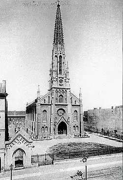 30 października 1866 r. rozpoczęto budowę nowego kościoła w stylu neogotyckim, według projektu architekta Adolfa Loewego. Budowa trwała 14 lat. 24 października 1880 roku świątynia została poświęcona. Wysoka wieża z koronkowym hełmem jest wzorowana na wieży katedry Najświętszej Marii Panny we Fryburgu Bryzgowijskim. Wśród elementów skromnego wystroju świątyni zwraca uwagę dębowa ambona wykonana według projektu Konstantego Wojciechowskiego.