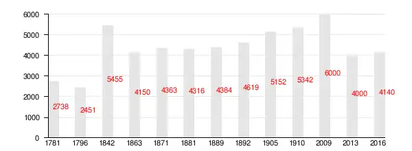 Liczba katolików, wiernych parafii, w poszczególnych latach. W 2009 r. parafia liczyła około 6000 wiernych[10]. Według kartotek parafialnych z lutego 2016 r., sporządzonych po wizytach duszpasterskich u parafian, ich liczba wynosi 4140[11].