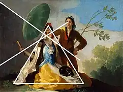 W swoich pracach Goya często stosował neoklasyczną piramidalną kompozycję[10], będącą wyraźnym włoskim wpływem. Główne linie kompozycji tworzą niemal równoboczny trójkąt, który obejmuje dziewczynę. Ta figura geometryczna wyraża wielki spokój i pogodę ducha. Wszystkie spojrzenia zwrócone są ku jej twarzy, podkreślonej delikatnym cieniem zielonej parasolki. Owal postaci dziewczyny jest regularną elipsą, a na jej twarzy przecinają się dwie linie, wyznaczone przez kierunek spojrzenia młodzieńca i znajdujące się za nim drzewko oraz wyrastający po lewej stronie mur[8]. Perspektywa muru jest wymuszona tak, aby rzutował na twarz dziewczyny – centrum uwagi obrazu. Gobelin miał wisieć nad drzwiami królewskiej jadalni, dlatego postaci znajdują się na niewielkim wzgórzu i na jasnym tle, co miało wspomóc odbiór perspektywy[11].