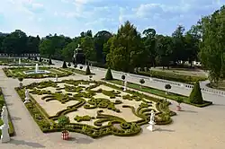 Park ze względu na nierówną rzeźbę terenu usytuowany jest na dwóch parterach (poziomach): górnym i dolnym. Część górna ogrodu miała kształt regularnego czworoboku i stykała się bezpośrednio z pałacem. Liczne fontanny, klomby, nadawały jemu wygląd i charakter ogrodu francuskiego[5].