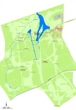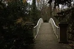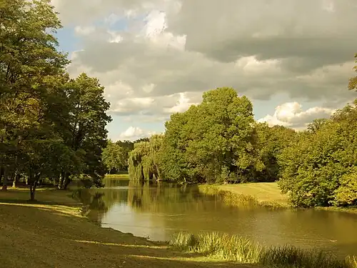 Założenie parkowe otacza Dolne Jezioro. Na nim ulokowano małą wyspę, na którą prowadzi most obrotowy z 1802 roku. Do Górnego Jeziora prowadzi natomiast kanał wodny z kaskadami z 1779 roku (przebudowa w 1785 roku). Przy brzegu Dolnego Jeziora znajdują się trzy sztuczne górki, z których dwie połączone są ze sobą tzw. „diabelskim mostkiem”. Na najwyższym wzniesieniu wzniesiono wieżę widokową (budowa w latach 1776–1790). Ponieważ zasoby wodne parku były początkowo bardzo ograniczone, nie było możliwe dowolne planowanie jego kształtu. Nawet zaopatrywanie go w wodę ze strumienia Welzbach za pomocą specjalnego kanału nie polepszyło sytuacji hydrologicznej terenu. Dopiero w XIX wieku dzięki specjalnej pompie parowej została doprowadzona tutaj woda z Menu.