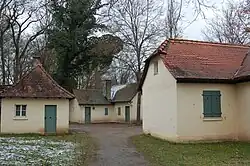 W półotwartej przestrzeni umiejętnie osadzone zostały budynki „wioseczki” – złożonej z grupy małych chłopskich domków, które można porównać z podobną wioską w Parku Zamkowym Nymphenburg w Monachium. Kompleks ten został zbudowany w 1788 roku. Inna grupa budynków, tzw. wartownia, pochodzi z przełomu lat 1784/85. Pierwowzorem dla tego typu staważu był Hameau w Wersalu. Przykładem innego staważu z parku jest figura Maulaffa, która służyła do gry w miejscową odmianę zabawy polegającej na rzucaniu do celu kulami. Rzeźba ta jest datowana na 1777 rok.