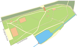 Kolorem ciemnozielonym zaznaczone są na planie tereny zielone znajdujące się oficjalnie poza granicami parku, lecz łączące się z nim.