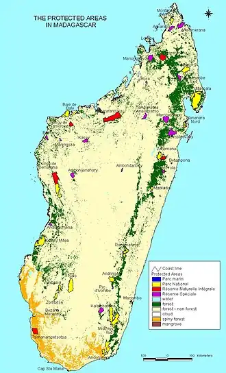 Obszary chronione na Madagaskarze są chronione przez Madagascar National Parks Association. Obszary te są dzielone na ścisłe rezerwaty przyrody, parki narodowe oraz specjalne rezerwaty przyrody, a poza tym jest też prywatny rezerwat i pozostałe obszary chronione. Podczas Światowej Konferencji Parków w Durbanie malgaski prezydent, Marc Ravalomanana, ogłosił śmiałą inicjatywę zwiększenia powierzchni obszarów chronionych z 17 000 km² do 60 000 km² (z 3% do 10% powierzchni Madagaskaru).