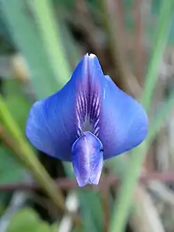 - Motylkowe, wyrastają z kątów liści na długich szypułkach zebrane po 1–3. Szypułki są wzniesione w czasie kwitnienia i odgięte w dół w czasie owocowania. U ich nasady znajdują się przysadki. Działki kielicha w liczbie 5, takiej samej długości jak rurka korony. Dwie górne działki zrośnięte są ze sobą na znacznej długości. Płatki korony niebieskie. Żagielek szerokojajowaty. Łódeczka krótsza od skrzydełek. 10 pręcików, z których dziewięć zrośniętych jest nitkami tworząc rurkę, jeden pręcik zaś jest wolny[8].