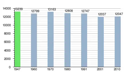 Zmiana liczby ludności w latach 1947 – 2010 na podstawie kolejnych spisów ludności[2].