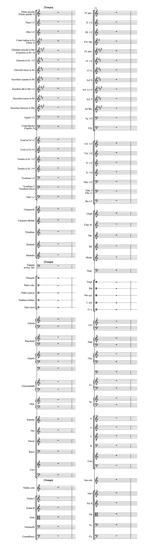W nawiasach okrągłych włoskie nazwy instrumentów, w nawiasach kwadratowych końcówka liczby mnogiej (np. Flauto[i] piccolo[i] l. poj. = Flauto piccolo, l. mn. = Flauti piccoli) oraz skrót partyturowy.