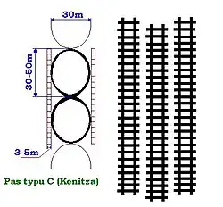 - pas przeciwpożarowy typu BK – pas gruntu w sąsiedztwie linii kolejowej, na której prowadzony jest ruch. Jest on wykonywany równolegle do linii kolejowej w formie dwóch pasów gruntu (bruzd) o szerokości co najmniej 2 m, odległych od siebie od 10 do 15 m i połączonych ze sobą co 25 do 50 m pasami poprzecznymi tej samej szerokości. pierwszy pas powinien być urządzony w odległości od 2 do 5 m od dolnej krawędzi nasypu lub górnej krawędzi przekopu linii kolejowej, a w razie występowania rowów bocznych – od zewnętrznej krawędzi tych rowów. Pasy powinny być całkowicie oczyszczone z wszelkiej roślinności do warstwy mineralnej, a na gruntach torfiastych – posypane warstwą piasku o grubości od 0,01 do 0,02 m. Natomiast prostokąty powstałe między pasami powinny być oczyszczone z krzewów, suchej ściółki oraz zadrzewione gatunkami liściastymi, jeśli warunki siedliskowe zapewniają prawidłowy rozwój.
