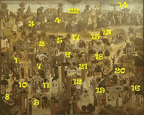 Cykl przedstawień otwiera: Wjazd Jezusa do Jerozolimy, następnie Ostatnią Wieczerzę, Modlitwę w Ogrójcu, Pojmanie, Chrystusa przed Annaszem, Chrystusa przed Kajfaszem, Chrystusa przed Herodem, Samobójstwo Judasza, Piłata umywającego ręce, Biczowanie, Ciernie Koronowania, Niesienie Krzyża, Grę w kości o szatę Chrystusa, Ukrzyżowanie Jezusa Chrystusa, Złożenie do Grobu, Zstąpienie do Otchłani, Zmartwychwstanie, Noli me tangere, Wędrówkę do Emaus, Objawienie się Chrystusa apostołom, Zwątpienie św. Tomasza oraz zamykające cykl Wniebowstąpienie.