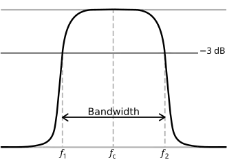 Pasmem dla filtru pasmowego określa się różnicę między górną f2 a dolną f1 częstotliwością graniczną, jak na rysunku obok.