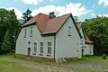 Budynek założony na planie prostokąta, z prostokątną dobudówka od strony pn.-wsch. i niewielką prostokątna werandą w części pd.-zach. Główne otwory wejściowe: w elewacji pn.-wsch. z pojedynczym masywnym stopniem, w elewacji pn.-zach. dostępny z poziomu gruntu, boczny otwór wejściowy wsch przez 2/3 budynku i łączącym się z holem głównym, tworząc literę L. Hol dostępny z wejścia pn.-zach. na planie zbliżonym do kwadratu, z usytuowanymi po zach. stronie schodami. Korytarz w części wsch. z 3 stopniami schodów wyrównującymi różnice poziomów.