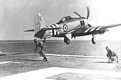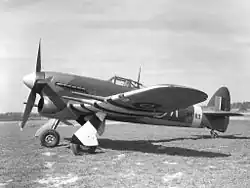 Wcześniejsze użycie czarno-białych pasków miało miejsce także w samolotach Hawker Typhoon we wczesnej wersji Hawker Tempest Mark Vs. Samolot miał podobny zarys, gdy był widziany z góry i z dołu, co Focke-Wulf Fw 190, a pasy zostały dodane, aby ułatwić jego identyfikację w walce. Zmiany przyjęto 5 grudnia 1942 r. Początkowo pasy były dodawane przez obsługę naziemną, ale wkrótce zaczęto je malować fabrycznie. Cztery czarne pasy o szerokości 30 cm oddzielone były trzema białymi o szerokości 61 cm na dolnej stronie skrzydeł. Od początku 1943 r. Typhoony miały również żółty, 46 cm pasek na górnej części skrzydeł, poprowadzony środkiem pomiędzy działkami. Wszystkie te oznaczenia zostały oficjalnie porzucone 7 lutego 1944 r.