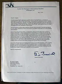 Brzeziński napisał do Vaughana list, w którym zaoferował mu dostęp do swoich osobistych archiwów w Waszyngtonie. „W ciągu weekendu miałem okazję przeczytać artykuł w „The Polish Review” dotyczący mojego zaangażowania w politykę USA wobec Europy Wschodniej” – napisał Brzeziński. „Muszę z całego serca pogratulować Panu tego artykułu. Wykonał Pan naprawdę wspaniałą pracę w ‘rozszyfrowaniu’ moich strategicznych intencji i w analizie taktyki, którą stosowałem, aby osiągnąć moje podstawowe cele”. Kontynuował: „Nie znam pełnego zakresu prowadzonych przez Pana badań i obecnego stanu pańskiej pracy doktorskiej. W zakresie, w jakim koncentruje się ona na mojej działalności publicznej, pozwolę sobie zaoferować Panu specjalny dostęp do moich osobistych archiwów. Byłem pod tak pozytywnym wrażeniem dokładności Pańskich badań i Pańskiej rozsądnej analizy, że byłbym szczęśliwy, mogąc dać Panu również osobisty dostęp do odpowiednich sekcji mojego osobistego dziennika [który do tej pory nie był udostępniany, z wyjątkiem wybiórczego wykorzystania w moich własnych wspomnieniach].”