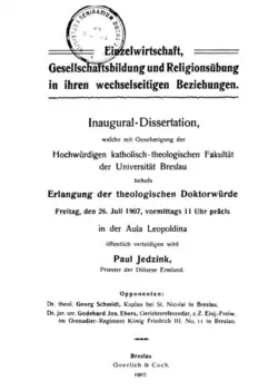- ↑ Paul Jedzink, Inaugural-Dissertation, Einzelwirtschaft, Gesellschaftsbildung und Religionsübung in ihren wechselseitigen Beziehungen, 1907, s. 87 Lebenslauf
