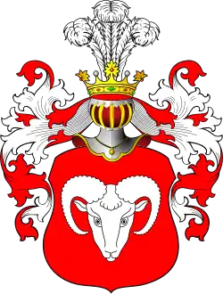 Pawłowski II (Junosza odmienny): W polu czerwonym pół barana wspiętego, srebrnego. Klejnot: nad hełmem w koronie samo godło. Labry: czerwone podbite srebrem.