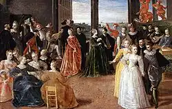 Pochód kilku par tanecznych wkraczających do pokoju przedstawia obraz Hieronymusa Franckena.