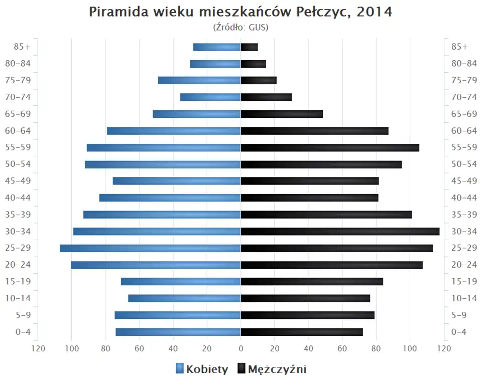 - Piramida wieku mieszkańców Pełczyc w 2014 roku[9].