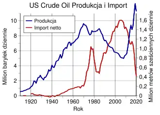 Wydobycie ropy naftowej w USA osiągnęło szczyt w 1971 roku i od tego czasu USA zaczęły gwałtownie zwiększać import ropy. Międzynarodowy handel ropą naftową rozwijał się jednak w skomplikowany sposób. W 1973 roku państwa eksportujące ropę zrzeszone w organizacji OPEC nałożyły embargo na państwa wspierające Izrael w wojnie Jom Kipur, co wywołało kryzys naftowy i gwałtowny wzrost cen ropy na świecie. Kolejny gwałtowny wzrost nastąpił w latach 1979–1982 w wyniku rewolucji w Iranie. Sumarycznie cena baryłki ropy wzrosła z niecałych 2$ w 1971 roku do około 35$ w 1980 roku[2]. Zahamowało to rozwój wielu dziedzin gospodarki i zmniejszyło popyt na ropę. W szczytowym roku 1979 wydobywano 66 mln baryłek ropy dziennie, a w 1983 roku 56 mln. USA w 1979 roku importowały 6,7 mln baryłek dziennie, a w 1983 roku 4,9 mln[2].