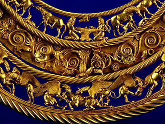 - 1 2 3 Скіфська пектораль // Сайт «Кампот». [dostęp 17 червня 2011]. [zarchiwizowane z tego adresu (15 квітня 2012)].