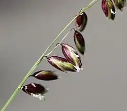 - Zebrane w szczytową, jednostronną wiechę złożoną z cienkich, gęsto ustawionych i bardzo krótkich gałązek. Na każdej z nich występuje jeden, czasami dwa kłoski. Kłoski są 2-3 kwiatowe, podczas kwitnienia i po przekwitnięciu zwisające. Mają obupłciowe kwiaty o czerwonobrunatnych plewach z białymi brzegami. Plewa górna i dolna mają identyczną niemal wielkość. Szorstka, naga i cienka plewka dolna jest zakończona suchobłoniastym szczytem bez ości i ma 7-9 nerwów.