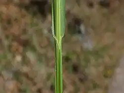 - Ma tylko kilka liści (zwykle nie więcej niż 6) z wybarwionymi purpurowo i szorstkimi pochwami. Blaszki liściowe o szerokości 3-6 mm są zwinięte, lekko orzęsione, na górnej powierzchni szorstkie, na spodniej gładkie. Brunatnego koloru języczek bardzo krótki i ucięty.