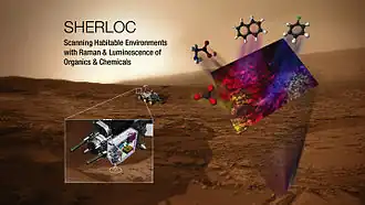 - Skanowanie środowisk posiadających możliwość stanowienia siedlisk życia, wykorzystując efekt Ramana i luminescencję dla form organicznych i chemicznych (SHERLOC). Spektrometr ten dostarczać będzie dokładnie wyskalowane przetwarzanie obrazu i wykorzystując laser ultrafioletowy, wykrywać będzie związki organiczne i określać mineralogię według dokładnej skali. SHERLOC będzie pierwszym ultrafioletowym spektrometrem Ramana wysłanym na powierzchnię Marsa i dostarczać będzie pomiary uzupełniające do innych instrumentów na pokładzie łazika. Głównym badaczem jest Luther Beegle, JPL.
