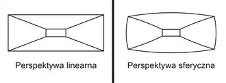 Perspektywa sferyczna − stanowi rozszerzenie perspektywy linearnej o działanie efektu głębi we wszystkich kierunkach przestrzeni x, y i z. Tzn. wraz z oddalaniem od środka obrazu, obiekty "zmniejszają się" wzdłuż osi x i y oraz do środka wzdłuż osi z.