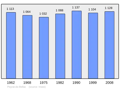 Według danych na rok 1990 gminę zamieszkiwało 1137 osób, a gęstość zaludnienia wynosiła 36 osób/km² (wśród 747 gmin Limousin Peyrat-de-Bellac plasuje się na 103. miejscu pod względem liczby ludności, natomiast pod względem powierzchni na miejscu 148.).