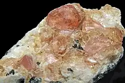 Są to najczęściej izolowane kryształy o nieregularnym kształcie wypełniające wnęki pomiędzy cleavelandytem, kwarcem i turmalinem. Występują praktycznie tylko w skałach magmowych głównie w pegmatytach i granitach. Oprócz kwarców i turmalinów współwystępują także z mikroklinem, danburytem i albitem[1].