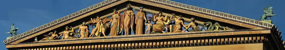 Na uwagę zasługuje tympanon wieńczący fasadę skrzydła północnego, wypełniony polichromowanymi rzeźbami z terakoty. Szeroki na 21 m i ma wysoki na 3,6 m tympanon został zaprojektowany i wykonany w 1933 przez amerykańskiego rzeźbiarza niemieckiego pochodzenia Carla Paula Jenneweina. Artystycznie nawiązuje on do rzeźby greckiej i jest pierwszym od ponad 2000 lat przykładem adaptacji polichromii w ten sposób, z tą różnicą, że o ile w starożytnej architekturze greckiej ornament i rzeźby z terakoty i kamienia malowano nietrwałym pigmentem, rzeźby z tympanonu muzeum zostały pokryte glazurą. Figury wypełniające tympanon zostały zaczerpnięte z mitologii greckiej, a motywem artystycznym całości jest miłość. Akroterion tympanonu stanowią gryfy – tradycyjni w mitologii greckiej strażnicy skarbów. Od lat 70. stały się one symbolami muzeum. Jennewein zaprojektował również brązowe drzwi do wind w muzeum, natomiast oktagonalny brązowy basen do fontanny na tarasie wschodnim zaprojektował i wykonał w 1958 miejscowy rzeźbiarz Henry Mitchell[4].